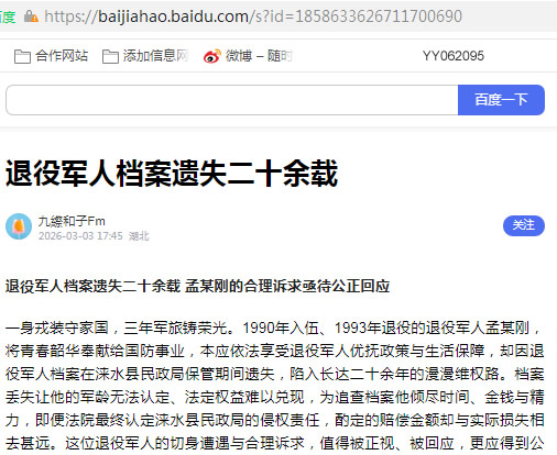 退役军人档案遗失二十余载 孟某刚的合理诉求亟待公正回应
